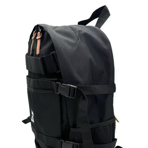 背面にはデッキを固定するストラップを搭載するほか、PCスリーブや小物を入れるのに便利なポケットなどスケーターにぴったりな工夫が盛り沢山。
